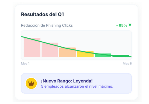 El resultado final no son solo métricas, es una cultura cambiada. Observa la reducción real del riesgo en tu dashboard, descarga reportes de cumplimiento para la ley y celebra cómo tus empleados ascienden a rangos de Baluarte y Leyenda.